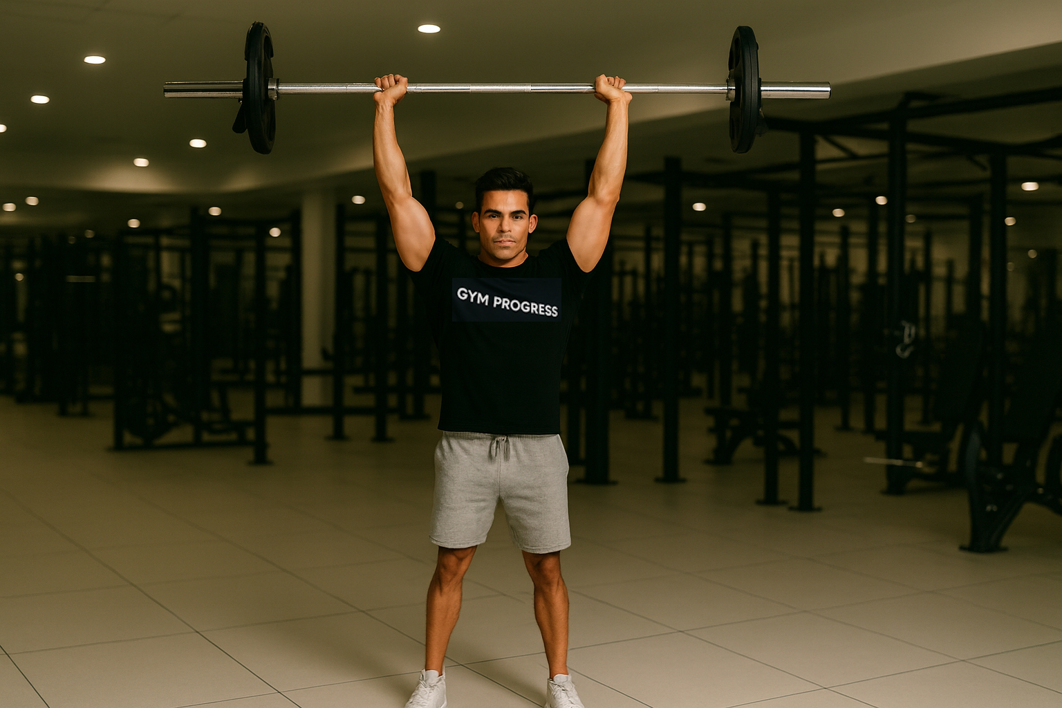 Stand or sit, grip the barbell at shoulder height, press it overhead until your arms are fully extended, then lower it back down.